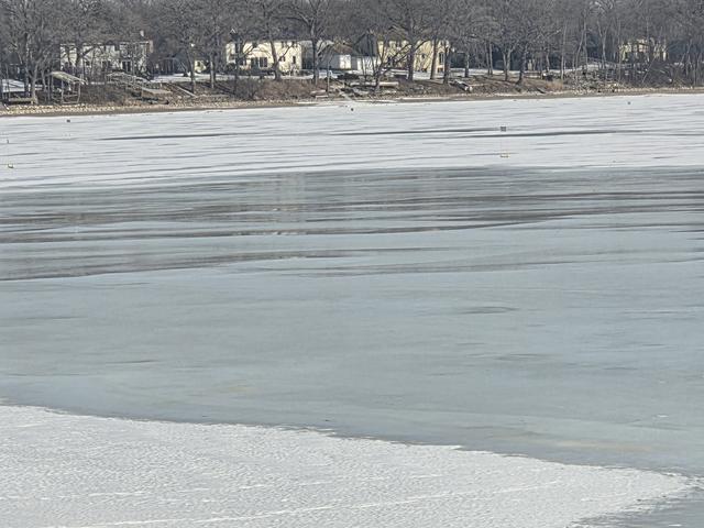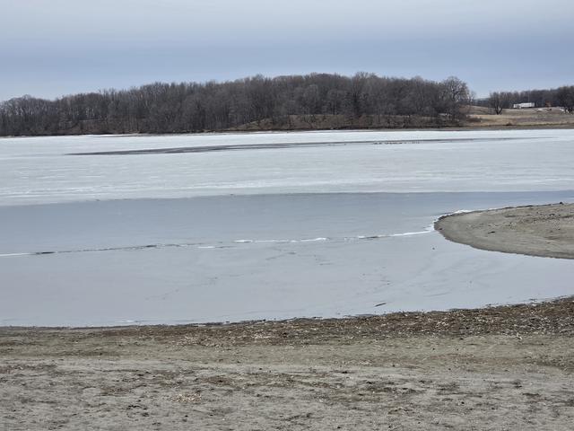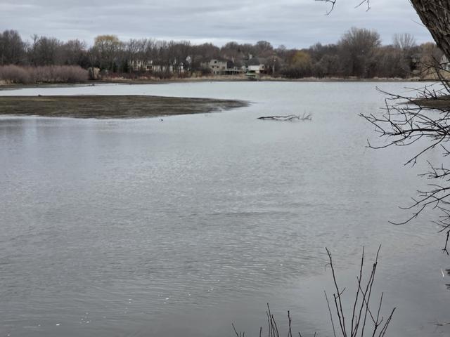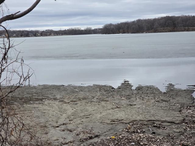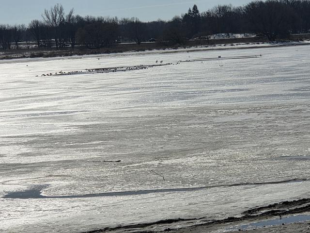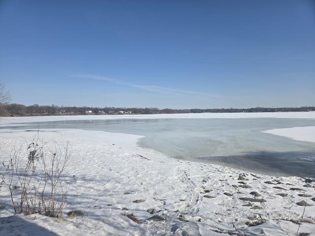 View from SW shoreline by Elm Creek Entry/I-94 overpass. Flow from Elm Creek is beginning to weaken ice in that area.